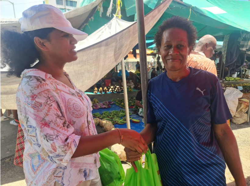 SWYAA Fiji member Ms. Devina Devi handing over a hygiene pack to a rural female market vendor